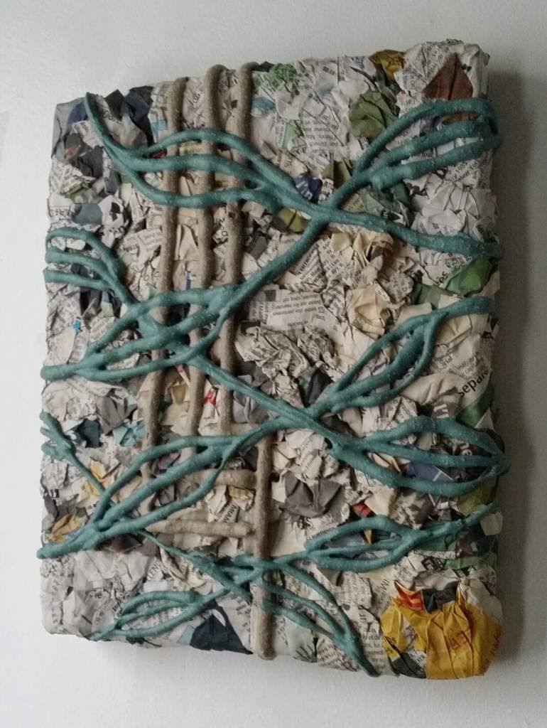 Papier journal sur grillage à poules, format 50x65x15cm, réalisation février 2019